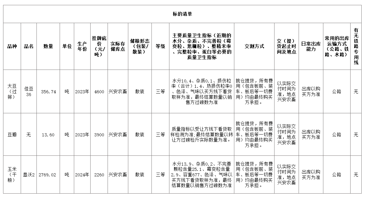 轉(zhuǎn)讓標的為大豆(佳豆36)356.74噸、玉米(墾沃2)2769.02 噸、豆瓣13.6噸,標的存放地位于呼倫貝爾市鄂倫春自治旗,詳情見標的清單(含主要質(zhì)量指標、存儲等信息):
